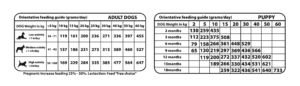 左:成犬適用 參考餵食量(單位:公克 / 天)